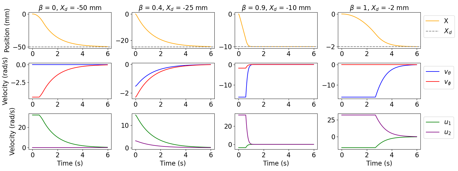 For the second paper that was submitted to Robosoft, a feedback controller using a gain scheduling scheme was used to control the position of the string. The string was made to be conductive; by measuring the change in voltage as the string was twisted or winched, the displacement of the string could be measured. The controller depended on a control allocation factor beta, which was a user-defined value between 0 and 1 that proportionally allocated control effort between the winching and twisting actions. The closer the value of beta was to zero, the more winching action was done.