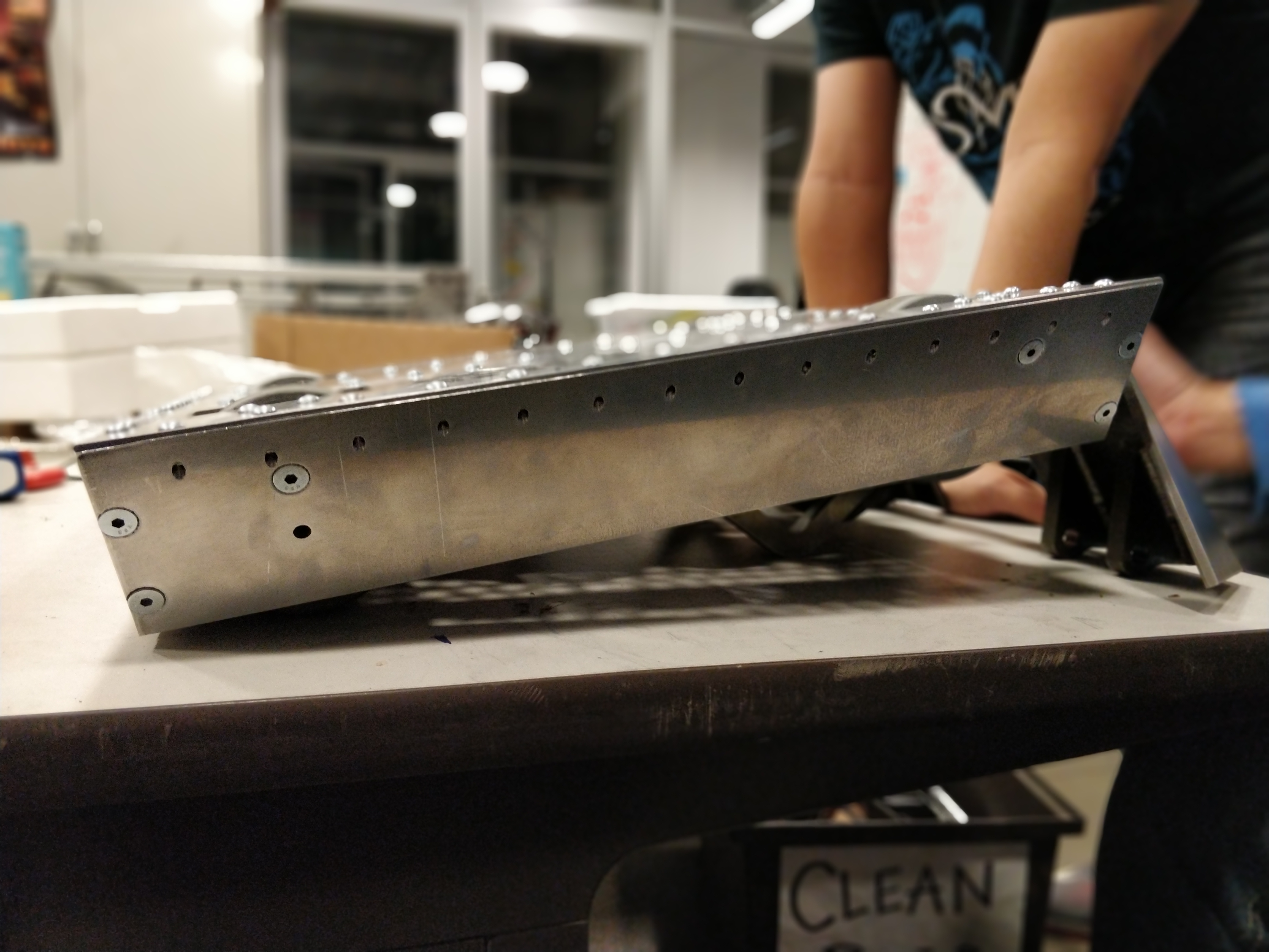 The metal blades were 1” thick AR400 steel sheets cut on a wire EDM, while the wedge was a ¼” thick 4140 steel sheet welded together after sectioned off with a wire EDM. The front wall with tabs connecting the wedge were made of 6013 for its weldability and durability. The remaining walls were made of waterjetted 7075 aluminum. Each of these waterjetted parts had holes drilled into the edges for mounting the top and bottom plates. The side walls and wheel mounts, being at an angle, required the use of an angle vise in order to mill bevels on the side walls and angled faces on the outermost wheel mounts.